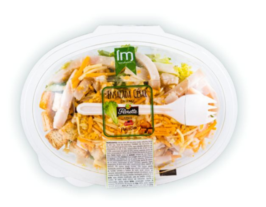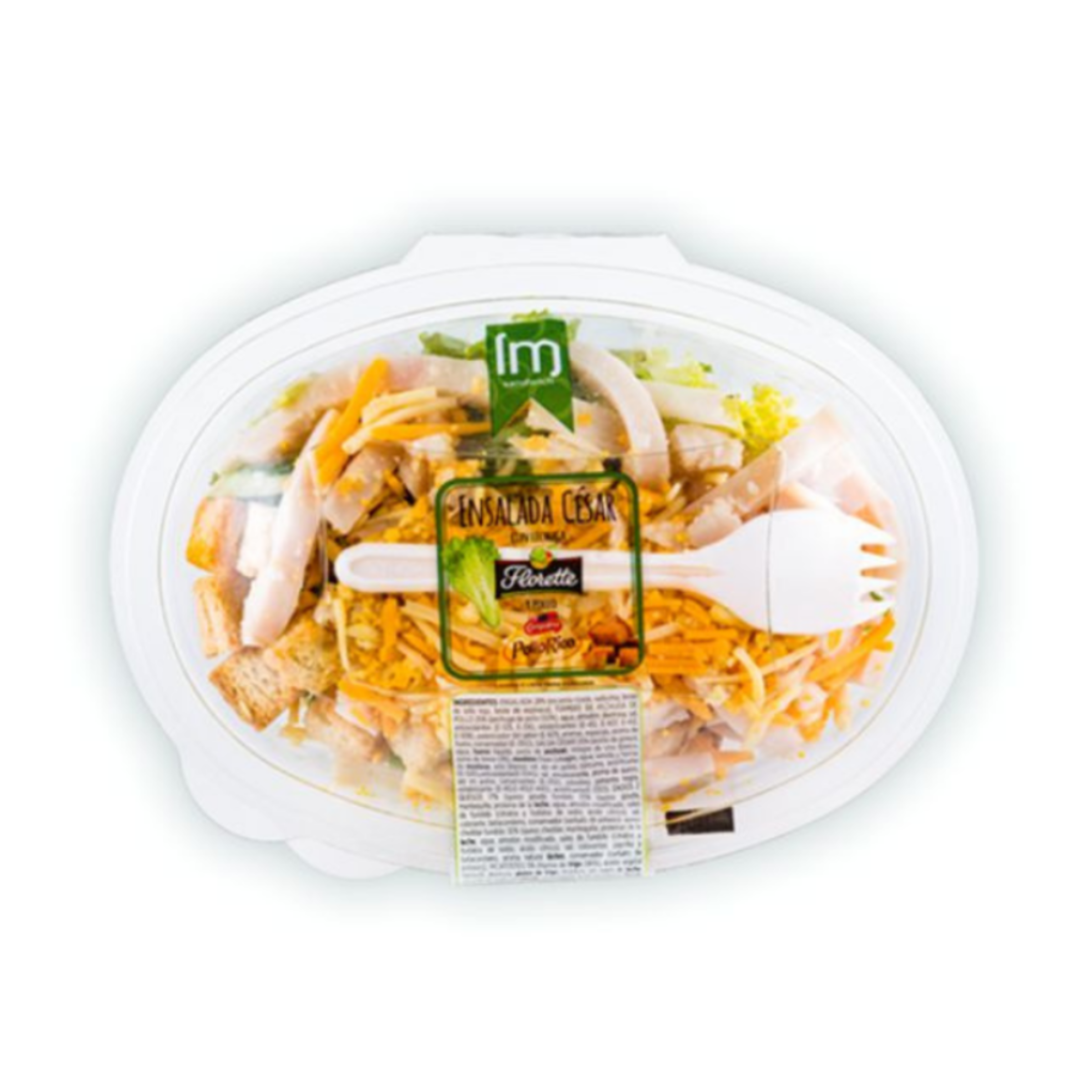Ensalada (28 %) (escarola rizada, radicchio, brote de lollo rojo y brote de espinaca), fiambre de pechuga de pollo (25 %) [pechuga de pollo (50 %), agua, almidón, dextrosa, sal, antioxidantes (E 325, E316), estabilizantes (E 451, E 407, E 412, E 508), potenciador del sabor (E621), aromas, especias, aroma de humo y conservador (E 250)], salsa césar (25 %) [aceite de girasol, agua, huevo líquido, pasta de anchoas, vinagre de vino blanco, zumo de limón (1 %), mostaza Dijon (vinagre, agua, semilla y harina de mostaza, vino blanco, sal, ajo en polvo, cúrcuma, acidificante E 330, antioxidante E 334), sal, emulsionante, aroma de queso, ajo en polvo, conservador (E 202), cebollino, pimienta negra, estabilizantes (E 412, E 415, E 440) y acidificante (E 330)], dados de dos quesos (17 %) [queso gouda fundido (70 %) (queso gouda, mantequilla, proteína de la leche, agua, almidón modificado, sales de fundido, sal, colorante betacaroteno y conservador sorbato potásico) y queso cheddar fundido (30 %) (queso cheddar, mantequilla, proteínas de la leche, agua, almidón modificado, sales de fundido, sal, colorantes paprika y betacaroteno, aroma natural lácteo y conservador sorbato potásico)], y picatostes (5 %) (harina de trigo, aceite vegetal de girasol, dextrosa, gluten de trigo, levadura, sal, suero de leche, extracto de malta de cebada y antioxidante ácido ascórbico).