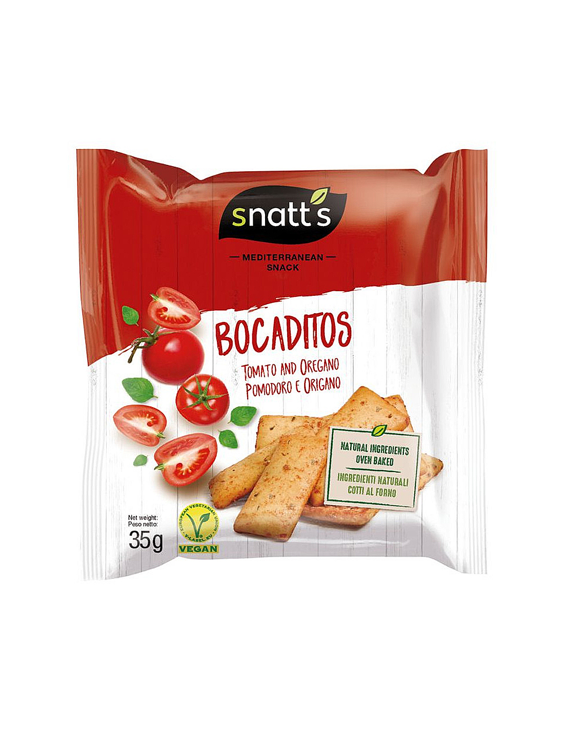 Snack horneado elaborado con harina de trigo, aceite de oliva y tomate, con un suave toque de orégano.
