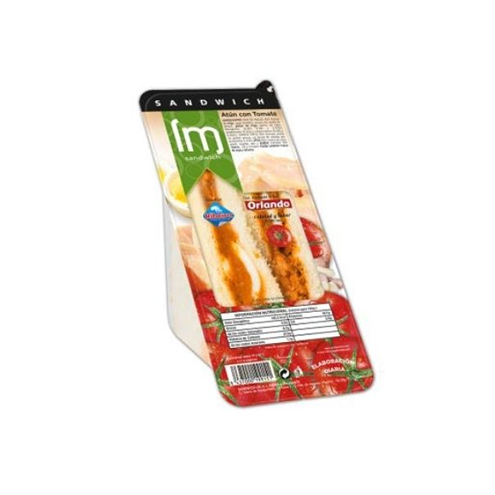 Sándwich clásico con bonito y tomate frito, elaborado con pan tierno y margarina para un sabor equilibrado.