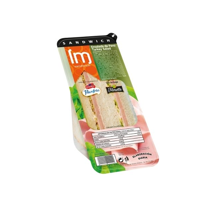 Pan de molde (46 %) (harina de trigo, agua, levadura, aceite vegetal de nabina, azúcar, sal, gluten de trigo, conservadores E 282, E 200 y E 202, almidón de maíz, harina de soja y agentes de tratamiento de la harina E 300 y E 920), fiambre de pechuga de pavo (31 %) [carne de pavo (44 %), agua, almidón, dextrosa, grasa de pollo, sal, estabilizantes E 451, E 407a, E 412, E 450, E 452 y E 508, aromas, potenciador del sabor E 621, antioxidante E 316 y conservador E 250], lechuga (16 %), mahonesa (5 %) (agua, aceite de girasol, huevo entero, vinagre de vino, acidulante ácido cítrico, azúcar, sal, estabilizantes E 412 y E 415 y conservador E 202) y kétchup (2 %) (tomate, vinagre de alcohol, azúcar, sal, especias y plantas aromáticas que contienen apio).