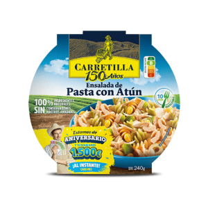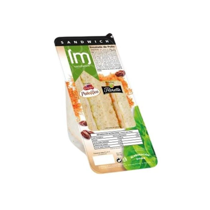 Pan de molde (46 %) (harina de trigo, agua, levadura, aceite vegetal de girasol, azúcar, sal, gluten de trigo, conservadores E 282, E 200 y E 202, almidón de maíz, harina de soja y agente de tratamiento de la harina E 300), pollo (31 %) [pechuga de pollo (50 %), agua, almidón, dextrosa, sal, antioxidantes E 325 y E 316, estabilizantes E 451, E 407, E 412 y E 508, potenciador del sabor E 621, aromas, especias, aroma de humo y conservador E 250], lechuga higienizada (7 %), zanahoria rallada (7 %), salsa fina (5 %) (aceite de girasol, huevo entero, vinagre de vino, agua, acidulante ácido cítrico, azúcar, sal, estabilizantes E 412 y E 415 y conservador E 202), cebolla caramelizada (2 %) y pasas de Corinto (2 %).