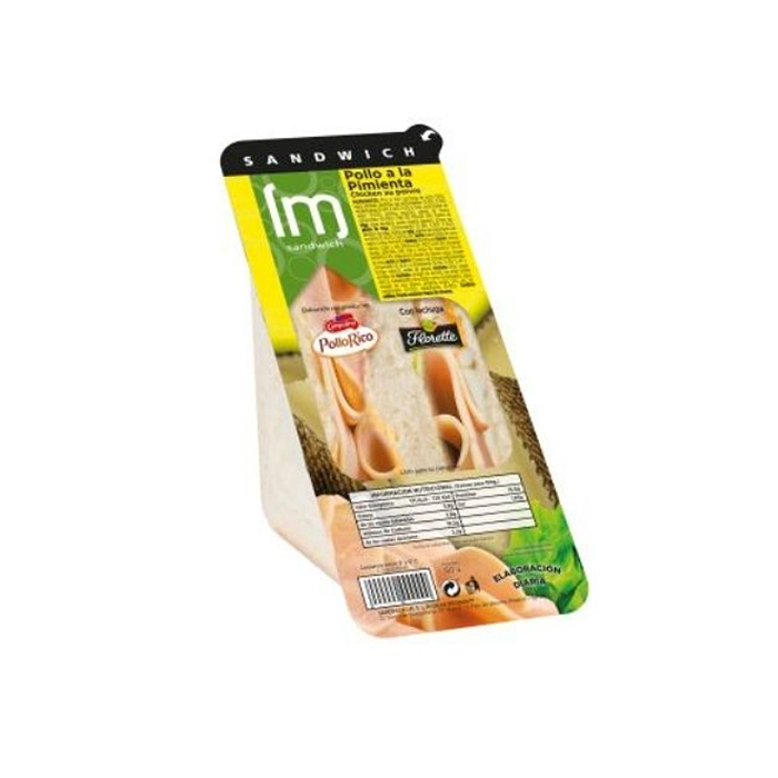 Pan de molde (41 %) (harina de trigo, agua, levadura, aceite vegetal de girasol, azúcar, sal, gluten de trigo, conservadores E 282, E 200 y E 202, almidón de maíz, harina de soja y agente de tratamiento de la harina E 300), pollo (39 %) [pechuga de pollo (50 %), agua, almidón, dextrosa, sal, antioxidantes E 325 y E 316, estabilizantes E 451, E 407, E 412 y E 508, potenciador del sabor E 621, aromas, especias, aroma de humo y conservador E 250], queso (11 %) [queso, grasas vegetales, agua, proteínas de la leche, almidón, gelatina, emulgentes E 471 y E 322, corrector de acidez E 330, antioxidantes E 306 y E 304, sales de fundido E 452 y E 339, sal, conservador E 202, colorante E 160a y aroma], lechuga (6 %) y salsa de pimienta (3 %) [mayonesa (aceite de girasol, agua, vinagre de vino, yema de huevo en polvo, sal, azúcar, maltodextrina, conservador E 202 y estabilizantes E 412, E 415 y E 417), aceite de girasol, mostaza Dijon (agua, semillas de mostaza, vinagre de alcohol, sal, ácido cítrico y metabisulfito potásico), agua, vinagre de vino blanco, pimienta negra (3 %), ajo, sal, conservador E 202 y estabilizante E 415].