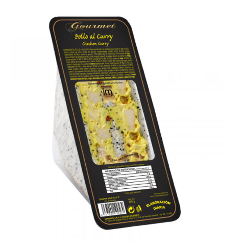 Pollo (47 %) [pechuga de pollo, sal, estabilizantes E 451, E 450 y E 407, aroma natural de pavo, jarabe de glucosa, conservadores E 262, E 270 y E 250, aroma, antioxidante E 316 y aceite de girasol], pan de semillas de amapola (44 %) (harina de trigo, agua, semillas de amapola (2,7 %), aceite vegetal de girasol, levadura, azúcar, sal, gluten de trigo, conservadores E 282, E 200 y E 202, emulgentes E 481 y E 472e, harina de soja, almidón de maíz y agentes de tratamiento de la harina E 920 y E 300) y salsa (9 %) [mahonesa (agua, aceite de girasol, vinagre de vino, yema de huevo pasteurizada, azúcar, estabilizantes E 412 y E 415, sal, acidulante E 330, conservadores E 202 y E 211, colorante E 160a y antioxidante E 385), mezcla de aceites vegetales (colza, girasol y lino), vegetales (cebolla, pimiento, ajo y puerro), sal, especias (cúrcuma, pimienta, paprika, chiles, jengibre, cilantro, cardamomo y comino), aromatizantes naturales, hierbas aromáticas, colorante curcumina y tandoori masala (especias, sal marina y mango)].