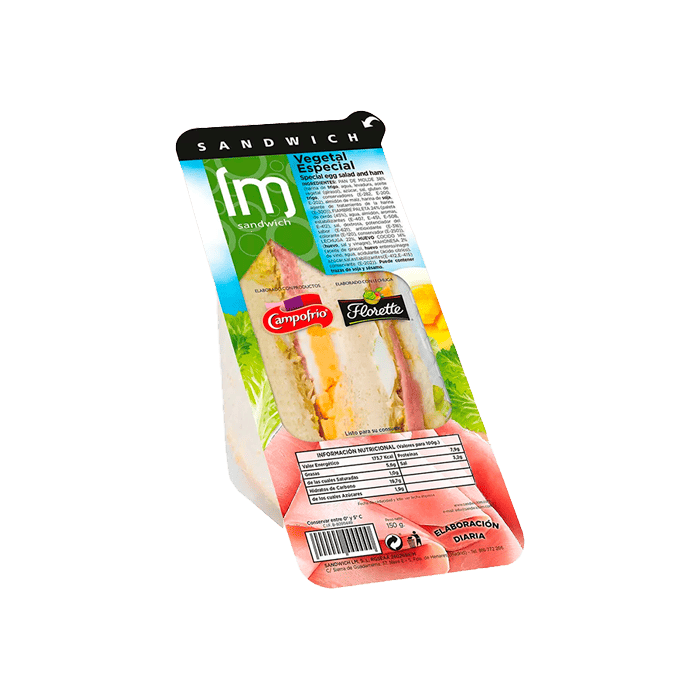 Pan de molde 38% (harina de trigo, agua, levadura, aceite vegetal (girasol), azúcar, sal, gluten de trigo, conservadores (E 282, E 200, E 202), almidón de maíz, harina de soja, agente de tratamiento de la harina (E 300)), fiambre paleta 24% (paleta de cerdo (45%), agua, almidón, aromas, estabilizantes (E 407, E 451, E 508, E 412), sal, dextrosa, potenciador del sabor (E 621), antioxidante (E 316), colorante (E 120), conservador (E 250)), lechuga 22%, huevo cocido 14% ( huevo, sal y vinagre), mahonesa 2% (aceite de girasol, huevo entero, vinagre de vino, agua, acidulante (ácido cítrico), azúcar, sal, estabilizantes (E 412,E 415)conservante(E 202)). Puede contener trazas de soja y sésamo.